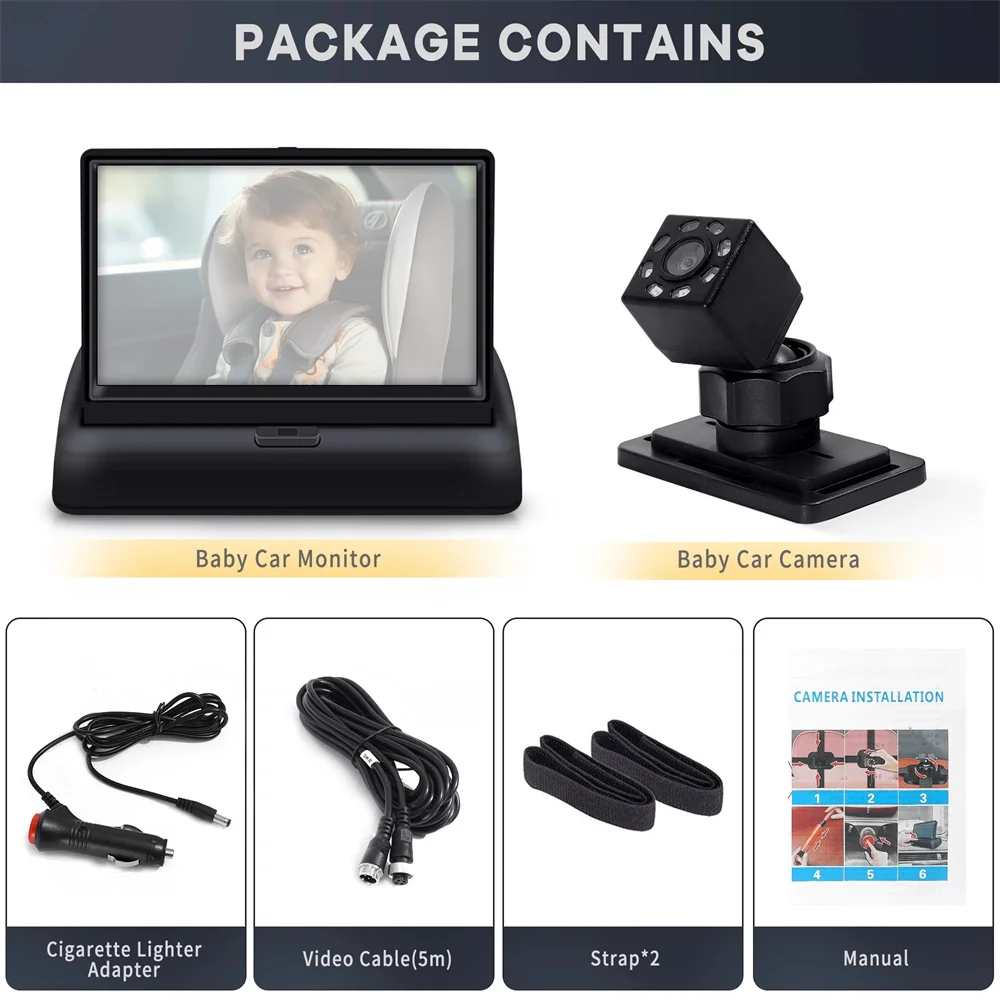 The baby monitor camera display is 4.3 inches and you can adjust the camera mirror according to your driving habits. Our baby car camera monitor for back seat with 120° wide-angle, providing a broad field of the rear view. The HD car camera supports 360° rotation to adjust to the angle you need. This wide coverage makes you can see the overall situation in back seat of your child, babies, dog pets in driving.