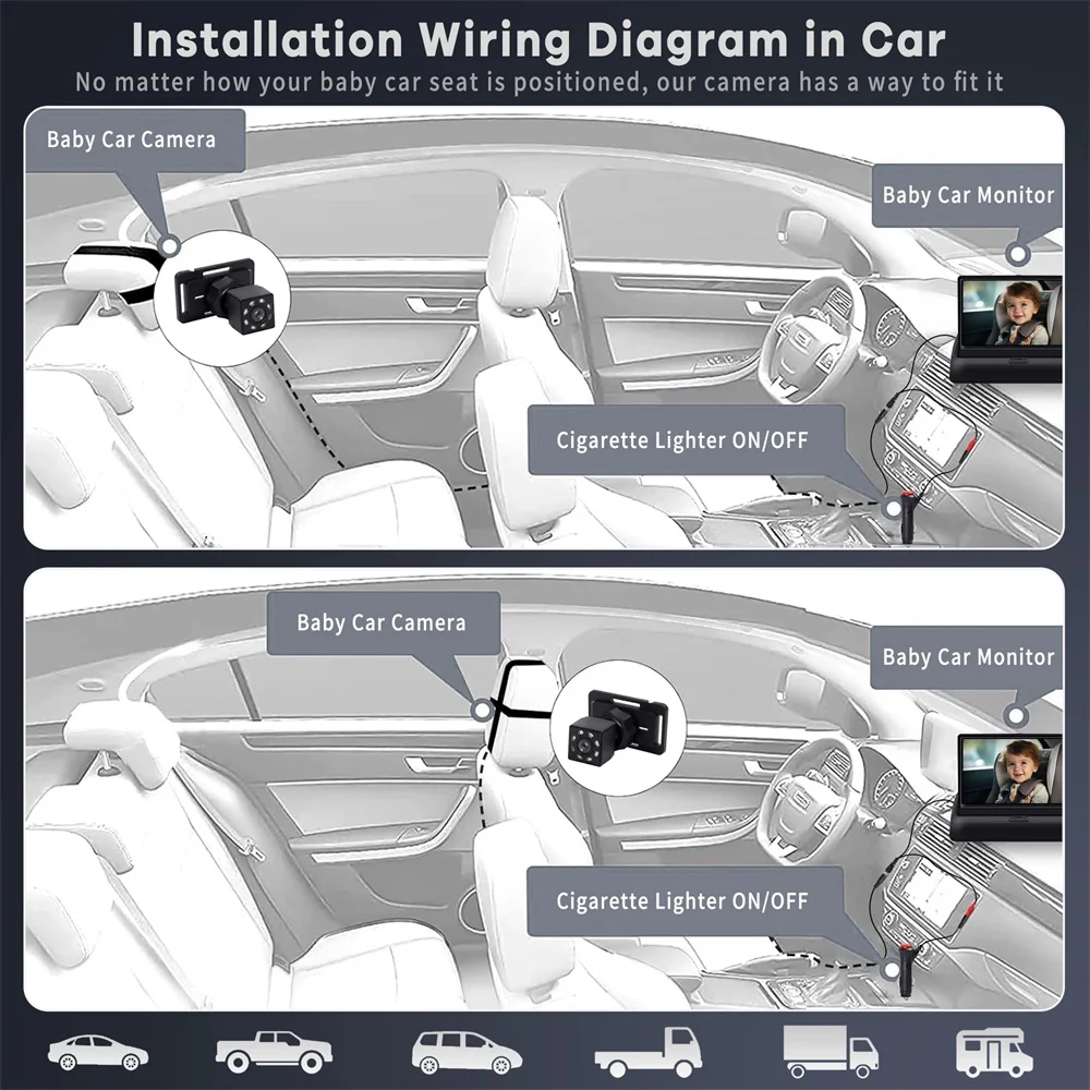 Our car seat camera for baby rear facing is bracket-mounted on the headrest's metal post to prevent movement or drop-Down, unlike strap-mounted ones prone to shaking. This baby car monitor with camera Is tool-free to install, just plug the power cord into the car's cigarette lighter and place the LCD display. The 5-meter extension cable fits most cars, trucks, vans, SUVs, etc.
